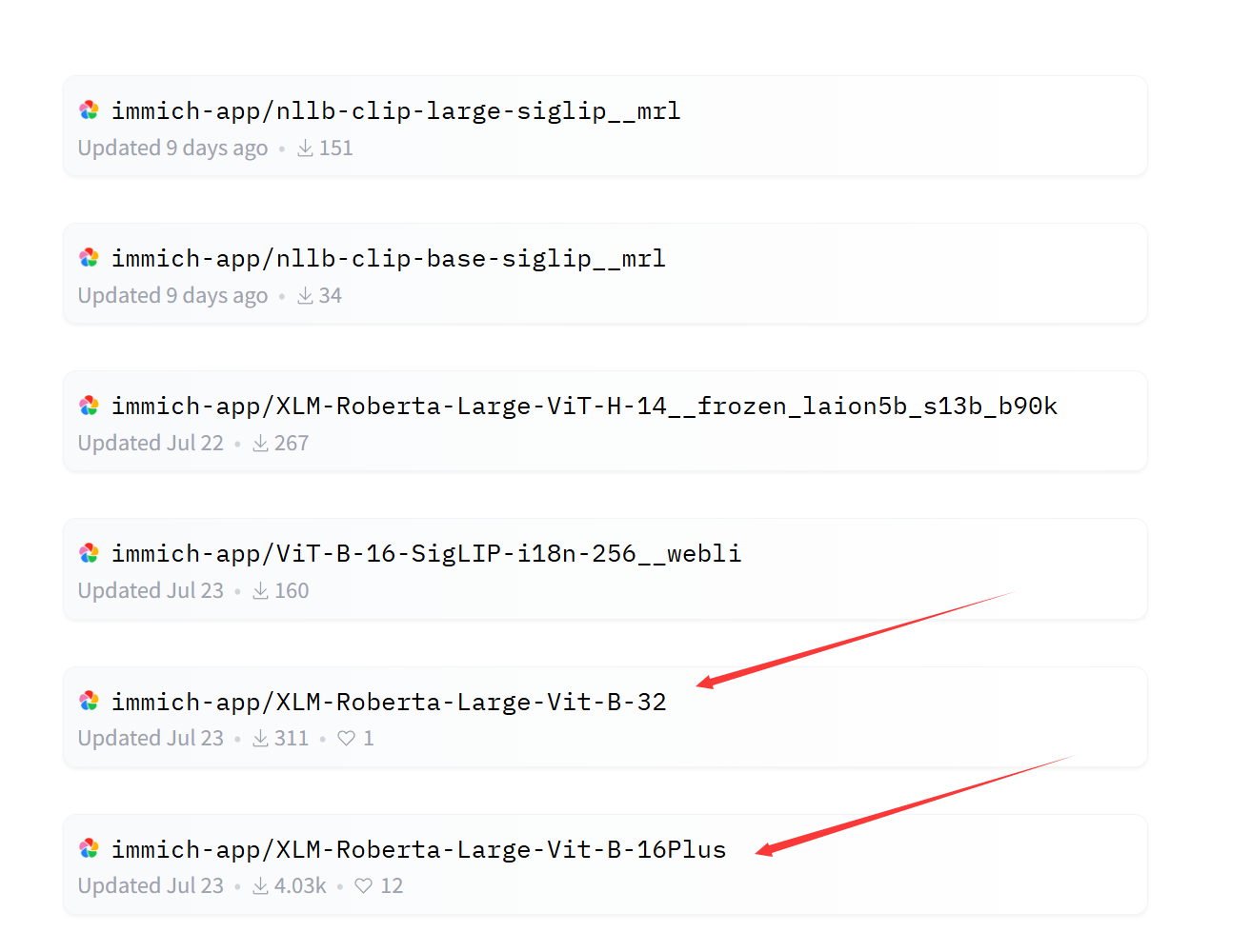 Immich 是支持使用描述文字搜索图片的,但默认的机器学习模型是 ViT-B-32__openai,这个模型并不支持中文。好在官方提供的模型中,有一个 XLM-Roberta-Large-Vit-B-16Plus 可以使用中文搜索。