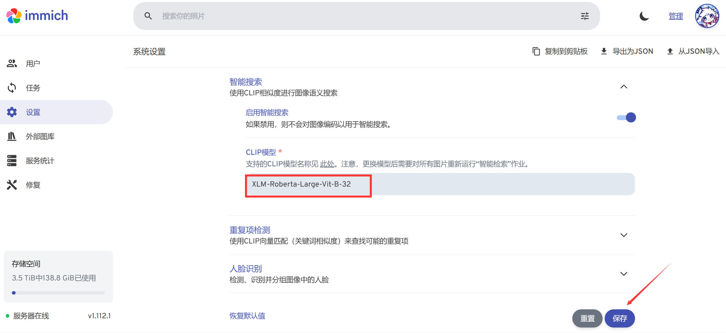如果 NAS 能够使用代理,我们直接前往 Immich 的管理 - 设置 - 机器学习设置 - 智能搜索 - CLIP 模型处修改 CLIP 模型名称。