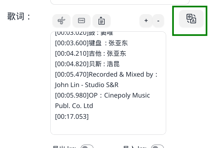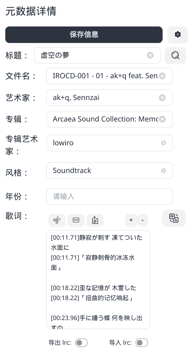 在歌词一栏,我们还可以点击“翻译”按钮,这样会添加同一时间轴的翻译歌词,在 Navidrome 当中可以显示出来。