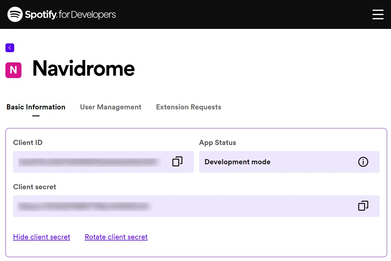 随后返回控制台,点击应用,进入应用设置,即可获取Client ID和Client secret。对应填入环境变量中的ND_SPOTIFY_ID和ND_SPOTIFY_SECRET。