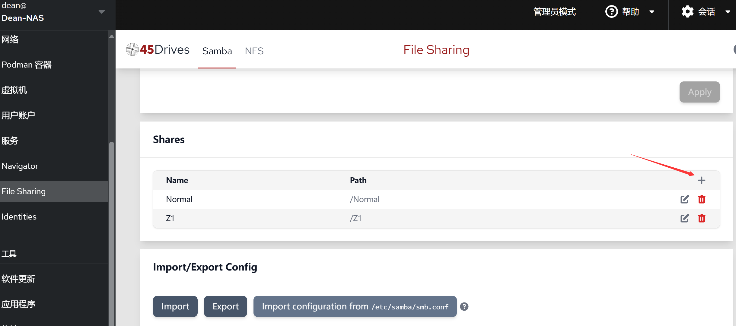 在 Cockpit 控制台中File Sharing - Shares处添加 SMB 共享: