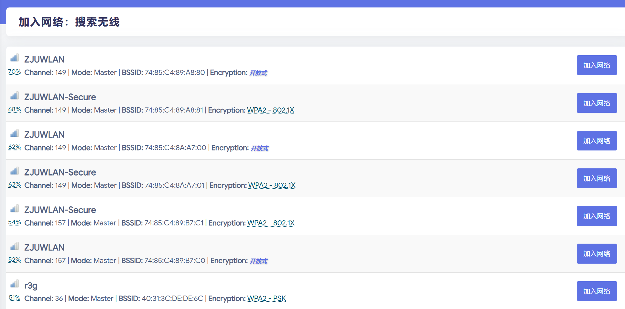 在网络 - 无线 - 无线概况中点击对应频段的扫描按钮,并连接对应无线网络即可。对于路由器连接校内 WiFi,请参照硬路由(3)—— 校园网 & 认证方案对应部分。