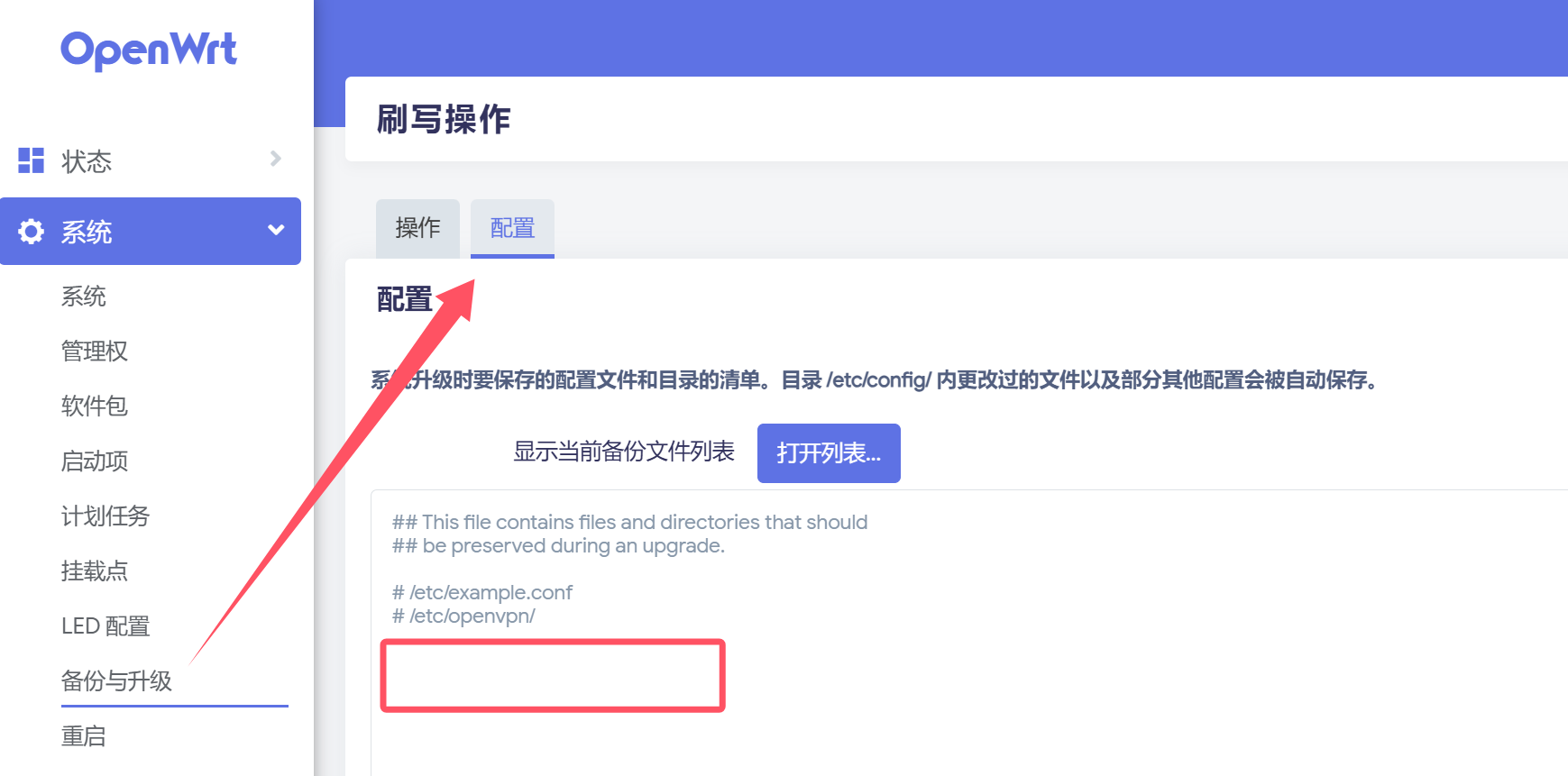 以上 Hotplug 脚本在刷写固件后会被删除。如要保留,请打开系统 - 备份与升级 - 配置,把/etc/hotplug.d/iface/05-miniupnpd-external-ip添加至列表中。