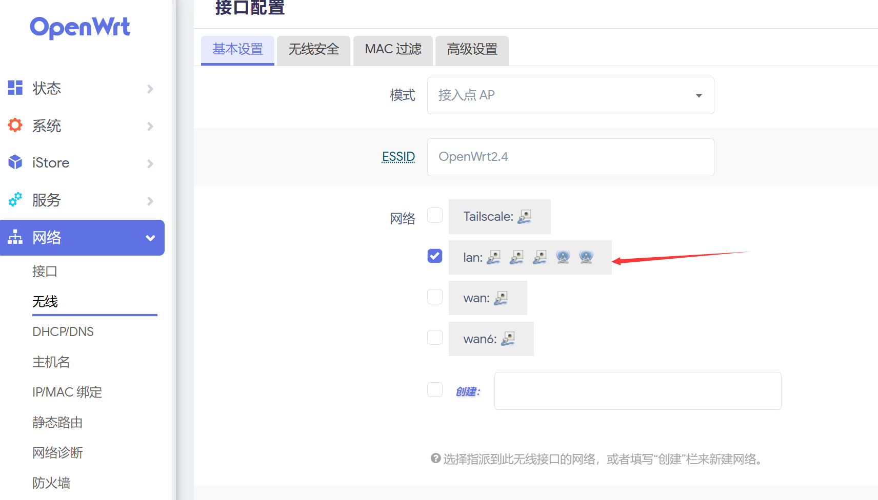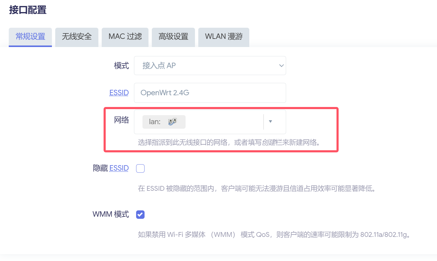 在无线 Master 模式配置中确认网络是否被指派到 lan 接口。