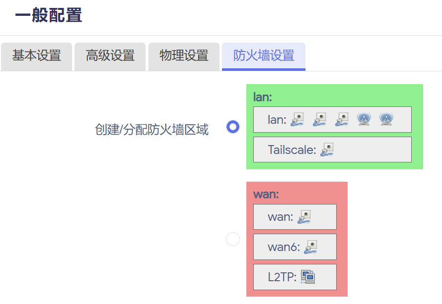 在网络 - 接口处新建一个接口,协议选静态地址,设备选tailscale0,地址为 Taliscale 管理页面上分配的地址,掩码255.0.0.0。防火墙区域选 lan 区域。