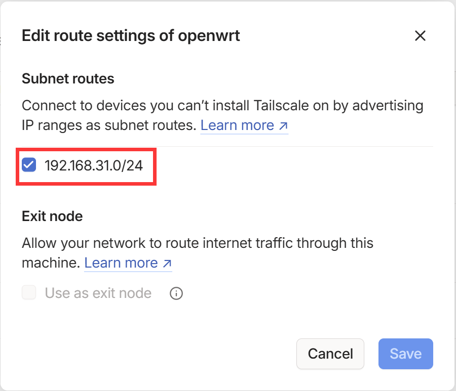 1 | tailscale up --accept-routes --accept-dns=false --advertise-routes=192.168.31.0/24 |
