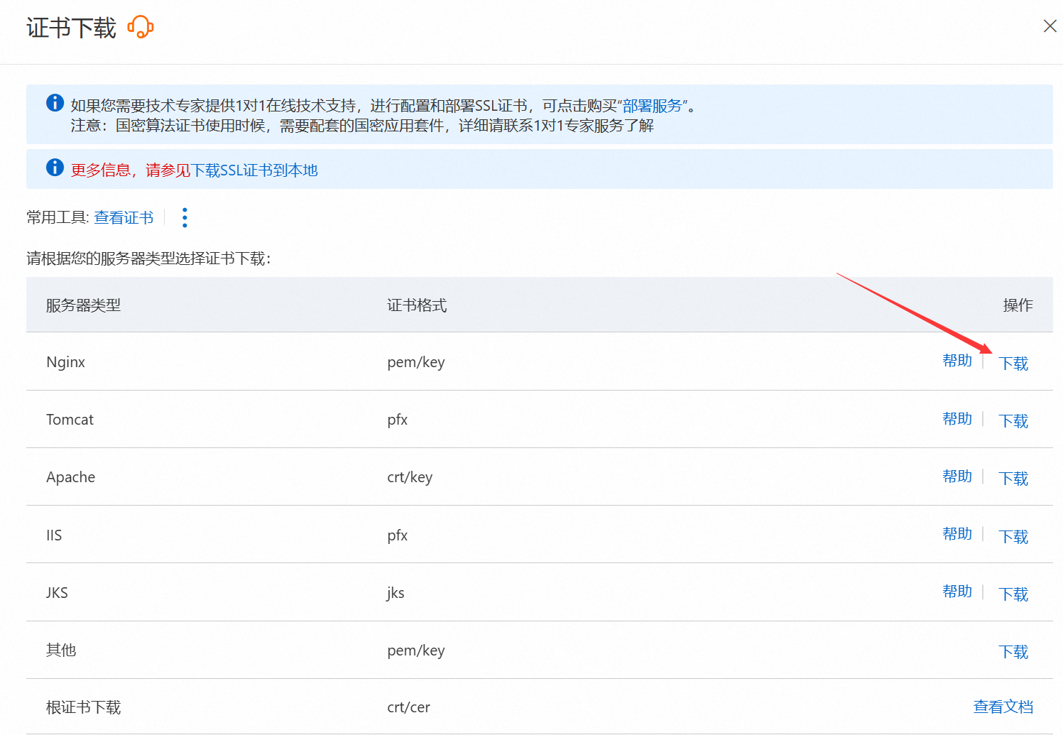 在阿里云控制台下载 Nginx 格式的证书,将.pem公钥后缀改为.crt,再上传至刚才创建的/usr/local/cert路径中。