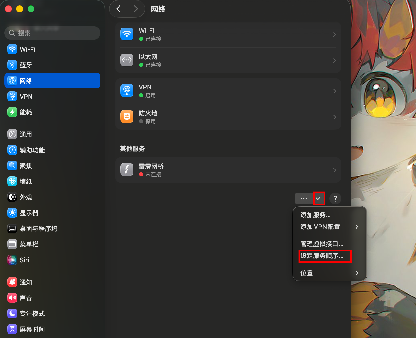 在 网络 - 设定服务顺序 中改变顺序,确保 Wi-Fi 接口的排序在以太网之上。