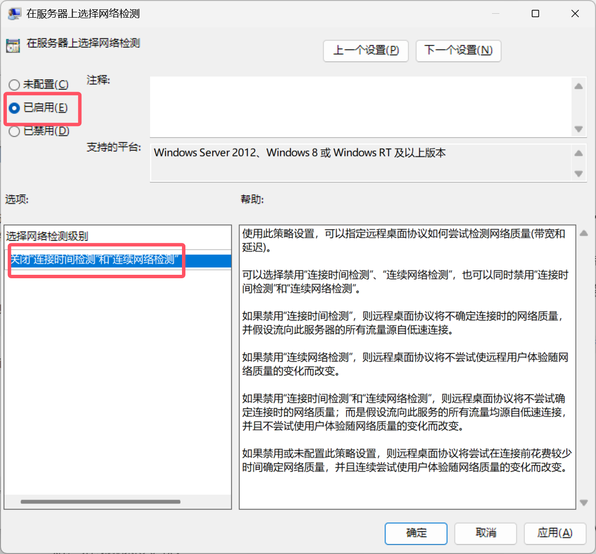 gpedit.msc,转到本地计算机策略 > 计算机配置 > 管理模板 > Windows 组件 > 远程桌面服务 > 远程桌面会话主机 > 连接 > 在服务器上选择网络检测。 - 将此策略设置为已启用,然后选择关闭“连接时间检测”和“连续网络检测”。