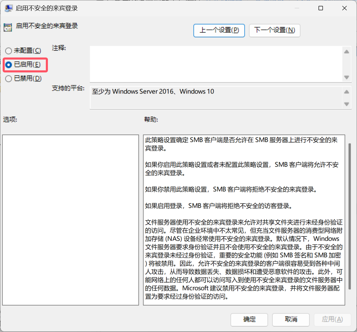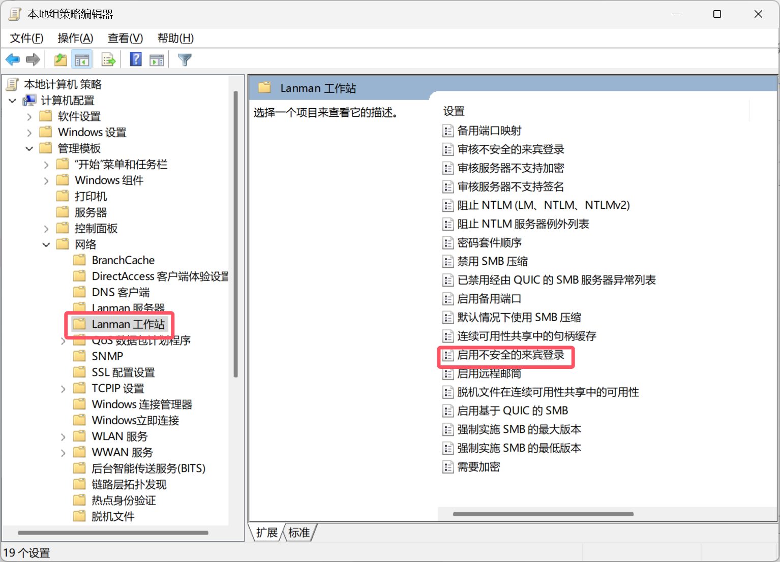在本地组策略编辑器中,选择计算机配置 > 管理模板 > 网络 > Lanman 工作站,双击启用不安全的来宾登录。